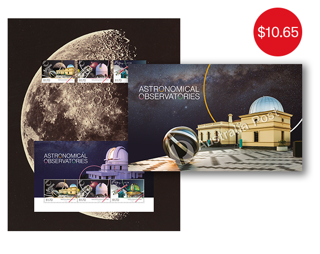 The stamp shows a contemporary illustration of the Great Melbourne Telescope, currently under restoration, and an 1875 photograph of the Moon as seen through this telescope.